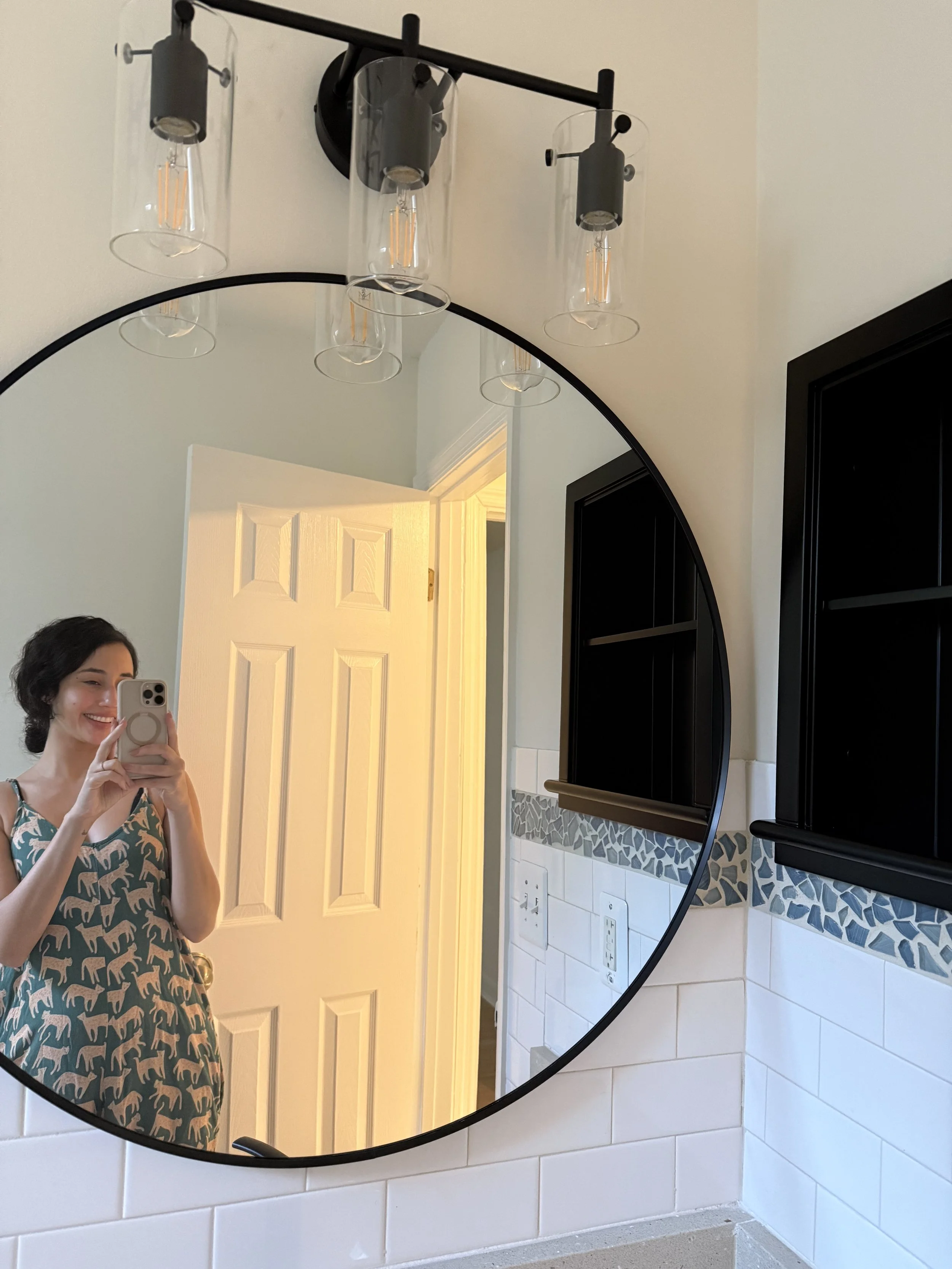Another bathroom detail I am especially proud of is this little conversion of the medicine cabinet. Both bathrooms had the old-style mirrored medicine cabinet ( you know the type) that awkwardly takes up space and doesn’t serve much purpose... Well, I was determined to remove it and replace it with open-concept shelving. After careful measuring and a lot of online searches, I found this one! It worked perfectly!